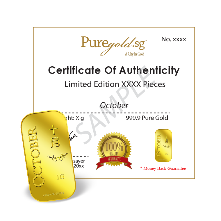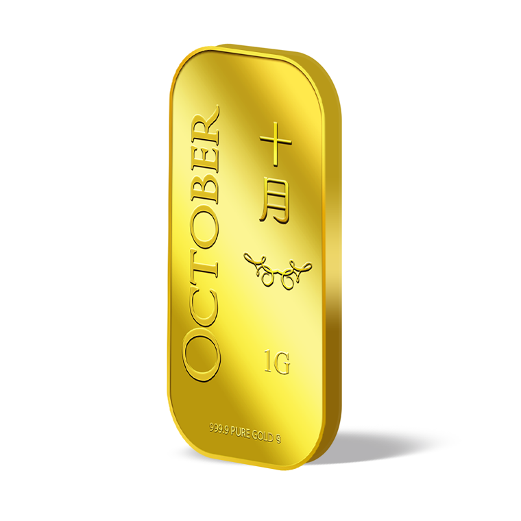 The image is embossed on a 1 gram 999.9 fine gold bar.